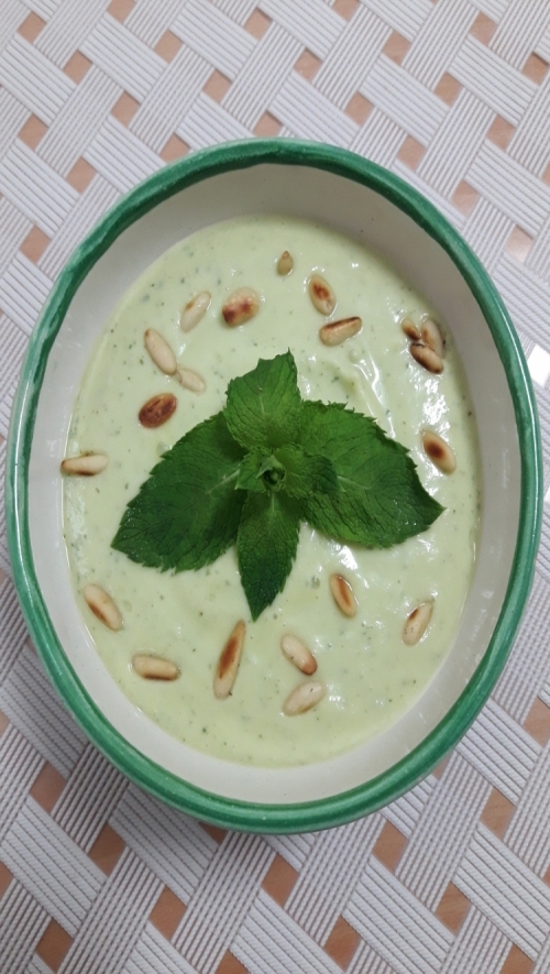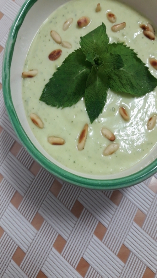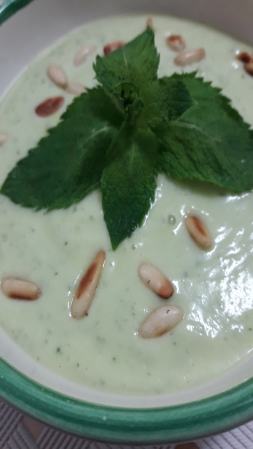 Una vez la crema se ha refrigerado, la ponemos en vasitos individuales, adornado con los piñones y algunas hojitas de menta.