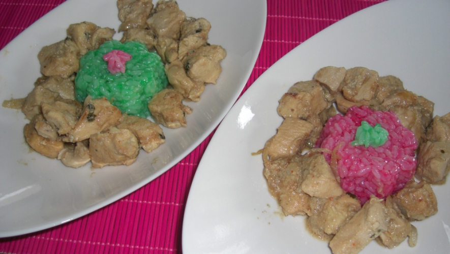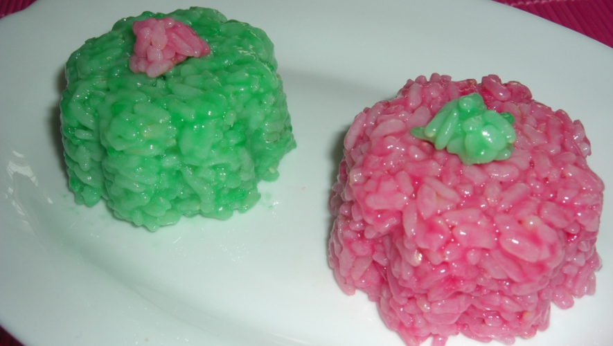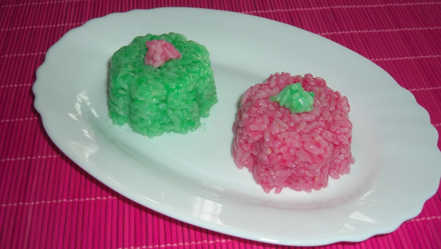 Dividimos el arroz en dos partes y coloreamos una de rosa y la otra, de verde y ponemos en unas flaneras.