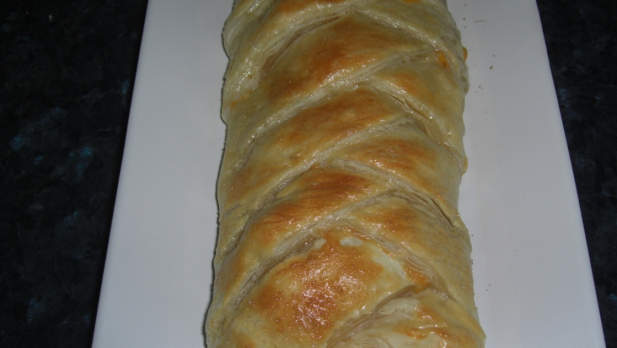 Ponemos el relleno en el centro del hojaldre y en los laterales hacer unos cortes como se ve en la foto e ir entrelazándolos hasta formar una trenza.Pintamos la trenza con yema de huevo y ponemos en el horno a 180º hasta que se vea dorada.