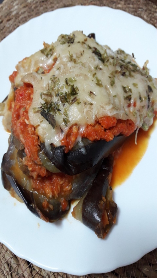 Lavamos las berenjenas y las cortamos en láminas a lo largo. Las salamos y las ponemos en un recipiente apto para microondas con un poco de agua, durante unos 6 minutos aproximadamente. Una vez hechas, las enjuagamos y escurrimos el exceso de agua. Reservamos.En una sartén con un poco de aceite sofreímos las verduras (pimiento, cebolla, zanahoria y ajos) previamente troceados. Una vez hecho, añadimos el tomate y las especias. Vamos removiendo y cuando reduzca algo, añadimos el atún escurrido (antes de echar el atún, podemos triturar la salsa), eso va a gustos.