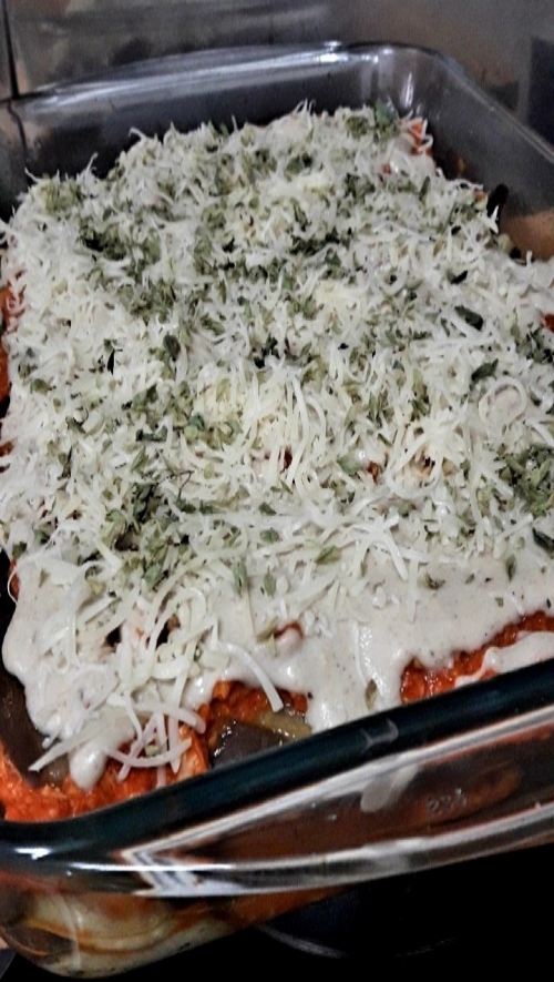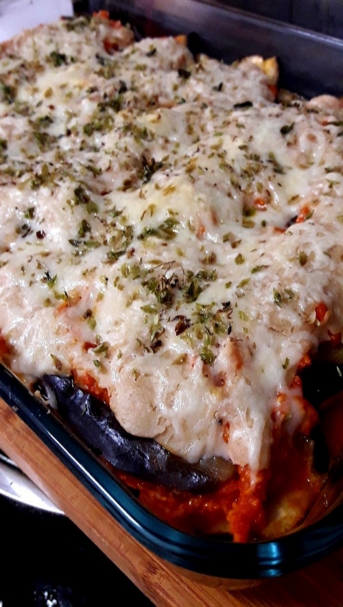 Para montar la lasaña, cogemos una bandeja apta para el horno. Ponemos una capa de berenjenas, luego otra de salsa de tomate y así sucesivamente. La última capa sera de bechamel, queso y orégano.
