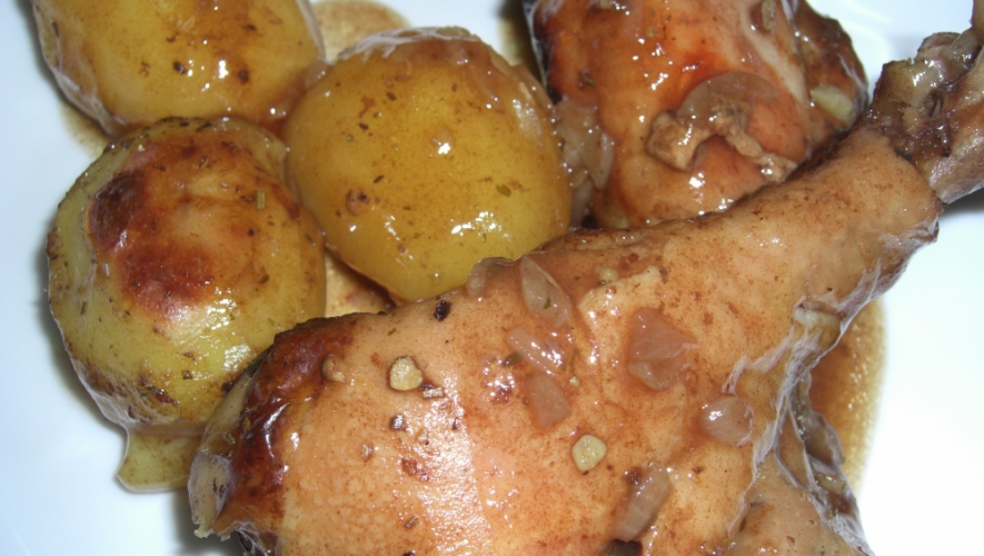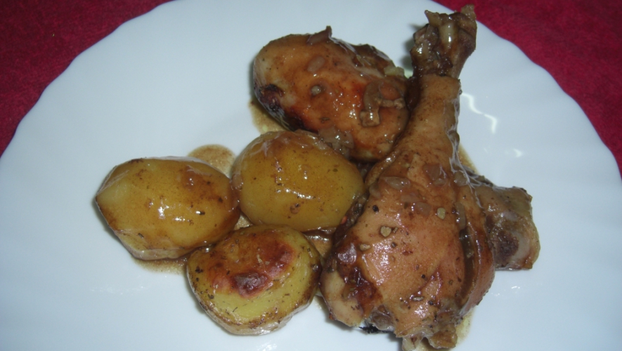Ponemos el pollo troceado y las patatas en una fuente para horno. Por encima echamos el sobre de sopa de cebolla y la lata de coca cola.Metemos a horno precalentado a 180º-200º, hasta que veamos que el pollo se ha dorado y las patatas estén tiernas.