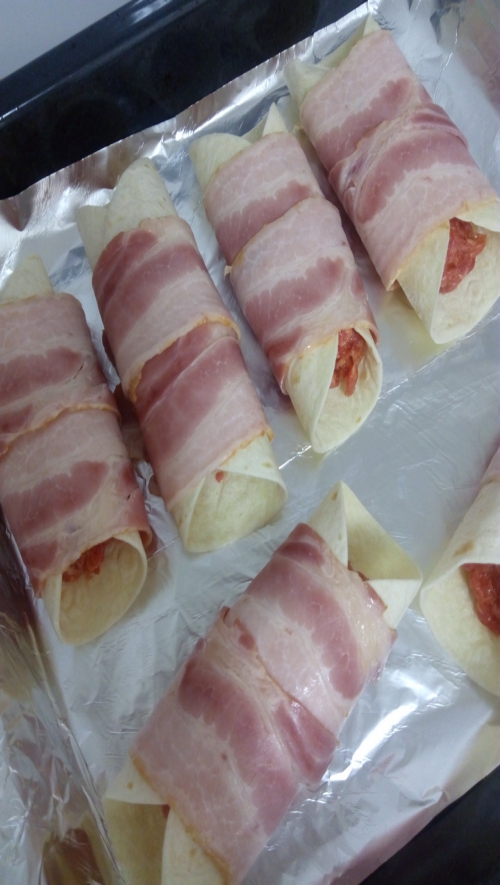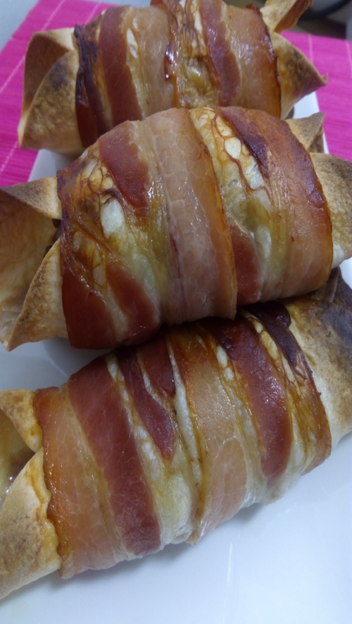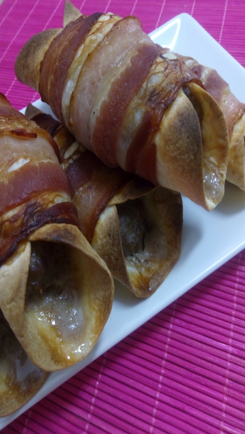 Ponemos la carne picada en un bol y añadimos el huevo, las especias y la sal y mezclamos bien.Rellenamos las tortitas de trigo con la carne picada y enrollamos. Liamos el rollito con el bacon (no es necesario sujetarlo con palillos). Cogemos una bandeja de horno, colocamos los rollitos y los metemos en el horno durante una hora mas o menos a 180ºC. Tapamos enseguida con papel de aluminio para que no se nos queme y quitamos unos minutos antes de que este hecho y doramos un poco.